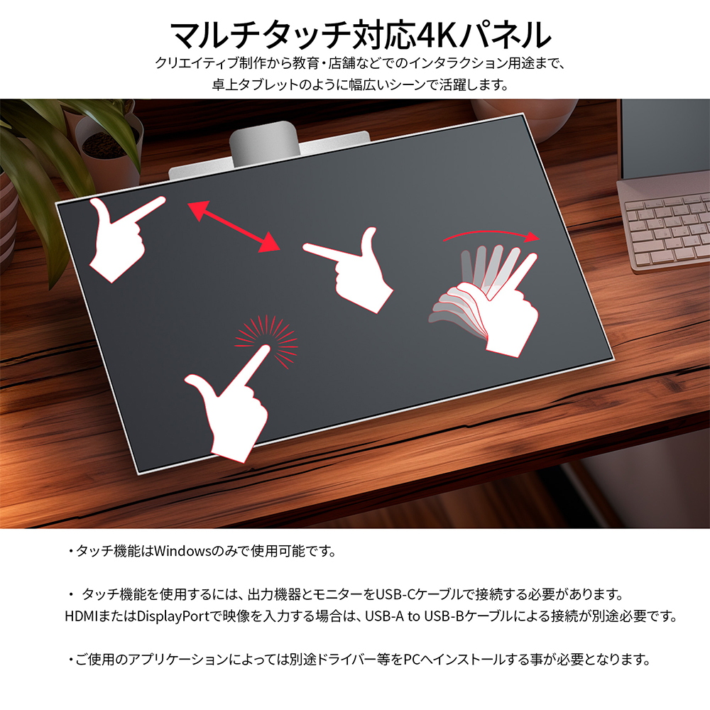 10点マルチタッチに対応しており、Windows PCと接続してピンチズームやスクロールなど直感的なタッチ操作が可能です。※タッチ機能を使用するには、出力機器とモニターをUSB-Cケーブルで接続する必要があります。HDMIまたはDisplayPortで映像を入力する場合は、USB-A to USB-Bケーブルによる接続が別途必要です。