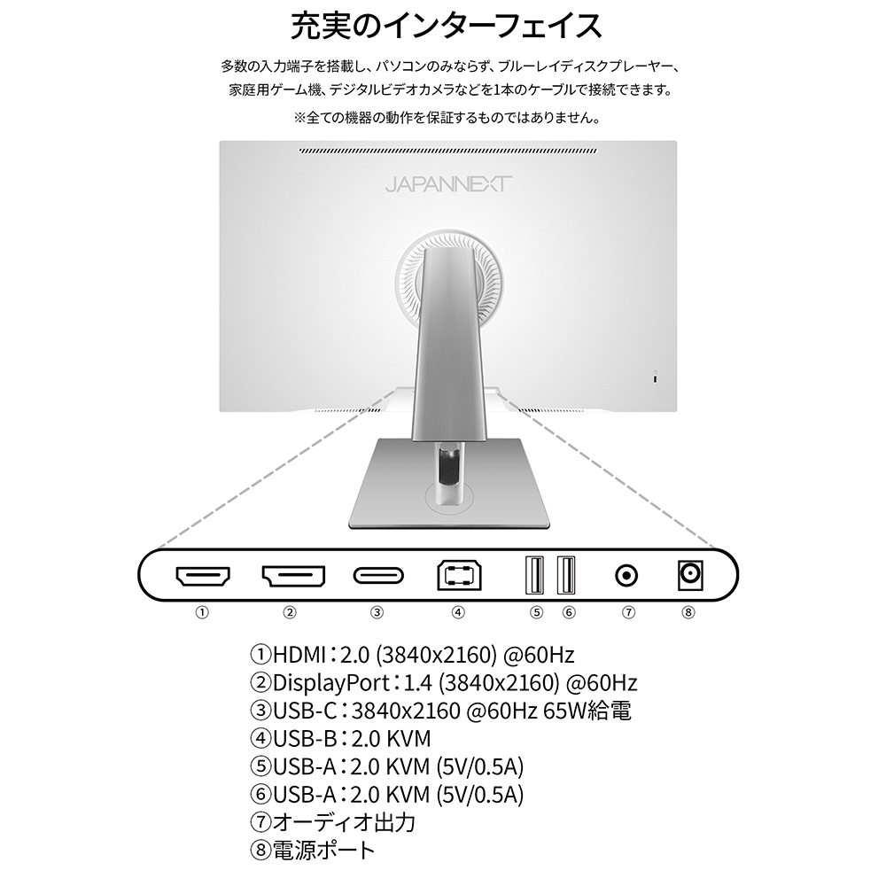 | 入出力端子 | HDMI 2.0 x1 (60Hz) DisplayPort 1.4 x1 (60Hz) USB-C x1 (60Hz/最大65W給電) オーディオ出力 x1 |