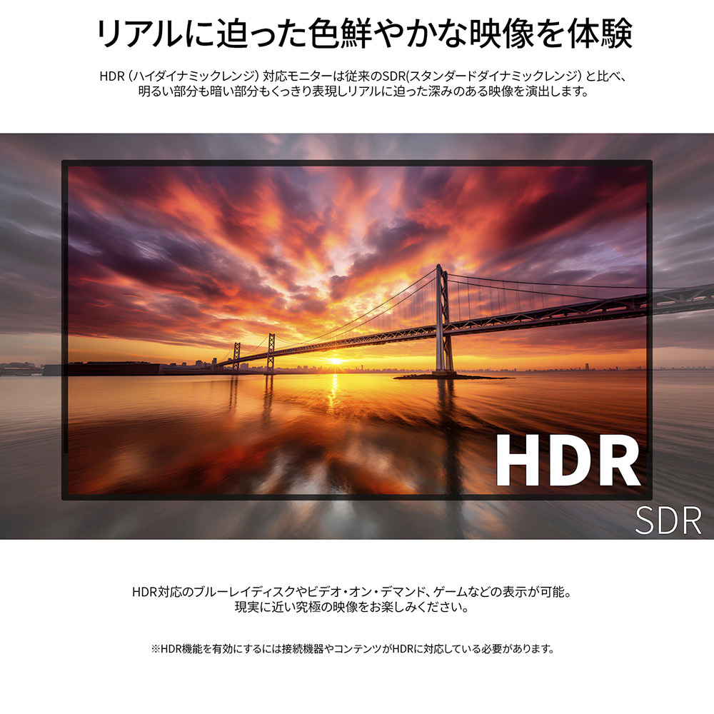 HDR(ハイダイナミックレンジ)に対応。明るい部分も暗い部分もくっきり表現し、リアルに迫った深みのある映像を演出します。HDR対応のブルーレイディスクやビデオ・オン・デマンド、ゲームなどの表示が可能です。