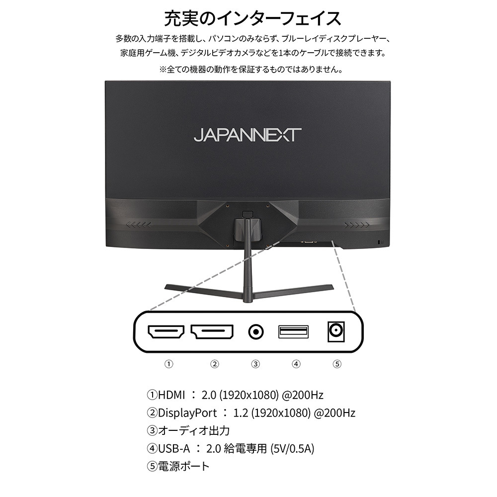 | 入出力端子 | HDMI 2.0 x1 (200Hz) DisplayPort 1.2 x1 (200Hz) オーディオ出力×1 |