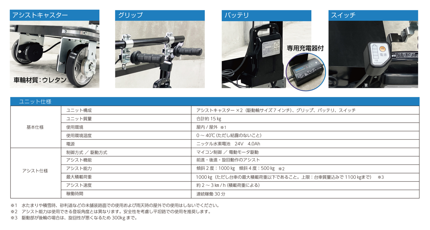 既存の台車に後付けが可能で、最大1tの重量物運搬を安全かつ効率的にアシストします。