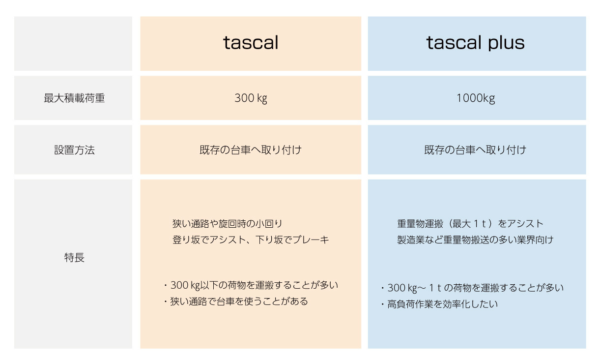 一方、新製品「tascal plus」は最大1tの重量物運搬に対応し、製造業や物流現場など高負荷作業の効率化を目的に開発されました。両モデルとも既存の台車に後付けが可能で、用途に応じて選択いただけます。