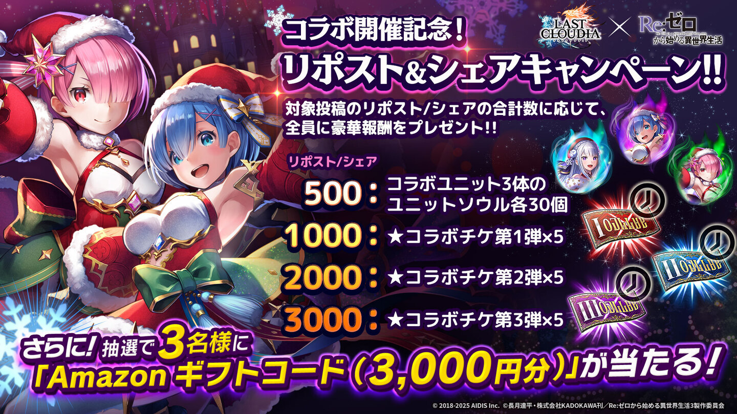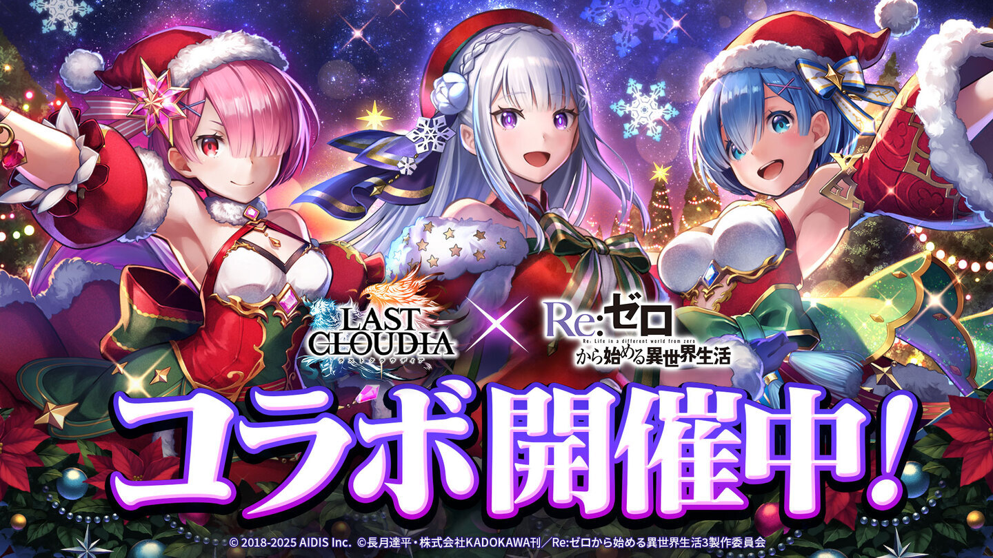 株式会社アイディス(本社:東京都渋谷区、代表取締役社長:早貸久敏)より好評配信中のスマートフォン向けRPG『ラストクラウディア』にて、本日2025年12月11日(木)より大人気TVアニメ『Re:ゼロから始める異世界生活』とのコラボイベント開始となりましたのでお知らせいたします。今回のイベントでは、コラボ第1弾として新ユニット「聖夜の煌き レム」と新アーク「聖夜のロズワール邸」、コラボ第2弾として新ユニット「聖夜の煌き ラム」と新アーク「精霊騎士と禁書庫の大精霊」が登場いたします。その他、イベント「絵本の中の世界」が開催となり、こちらのイベントに参加すると復刻ユニット/アークの中から1つ選んで交換できる「★復刻コラボ引換券」がもらえます。また、「コラボチャレンジ」や「コラボログインボーナス」、さらに最大100連の1日1回無料10連ガチャなど豪華キャンペーンも開催中となっております。