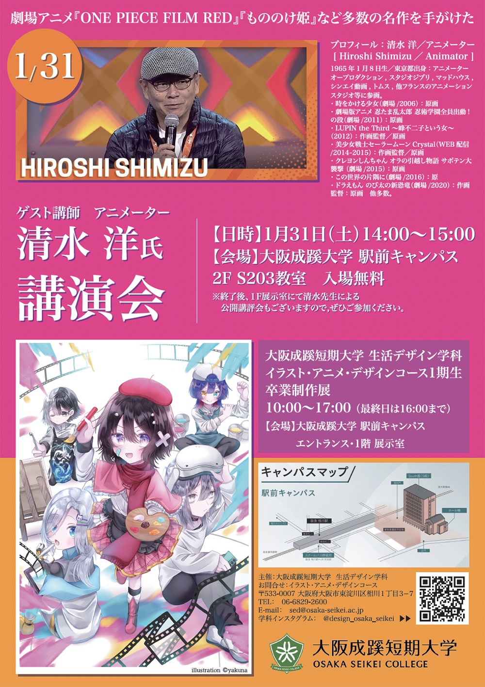 大阪成蹊短期大学(大阪市東淀川区/学長:紺野昇)生活デザイン学科 イラスト・アニメ・デザインコースの卒業制作展を、2026年1月31日(土)~2月1日(日)に開催します。また特別プログラムとして、多数の名作を手掛けたアニメーター清水洋氏による講演会と公開講評会を開催します。