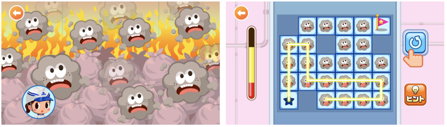ごみ処理施設で発生した排ガスが充満したマスを、スタートからゴールまで、重複なくすべて通ってつなげるパズルゲームです。全てのマスを通ってゴールすると、排ガスがきれいな空気に変わる演出が流れ、環境を守る工程を視覚的に理解できます。