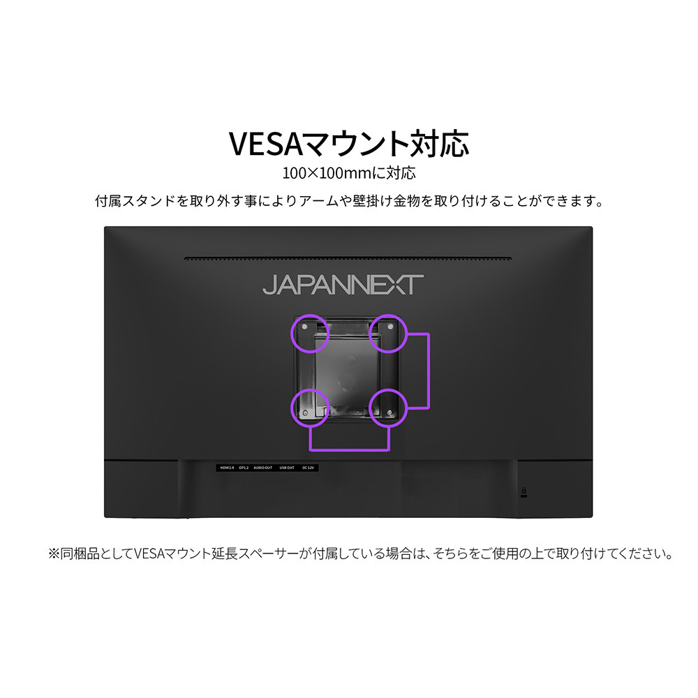 100x100mmのVESAマウントに対応しますので、別売りのモニターアームなどに使用が可能です。スピーカーは搭載しておりません。