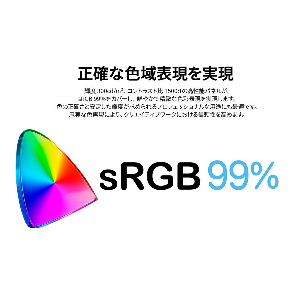 最大輝度300cd/m2の液晶パネルはsRGB:99%の広色域に対応。コンテンツを色鮮やかに映し出し、動画や写真の編集に最適です。