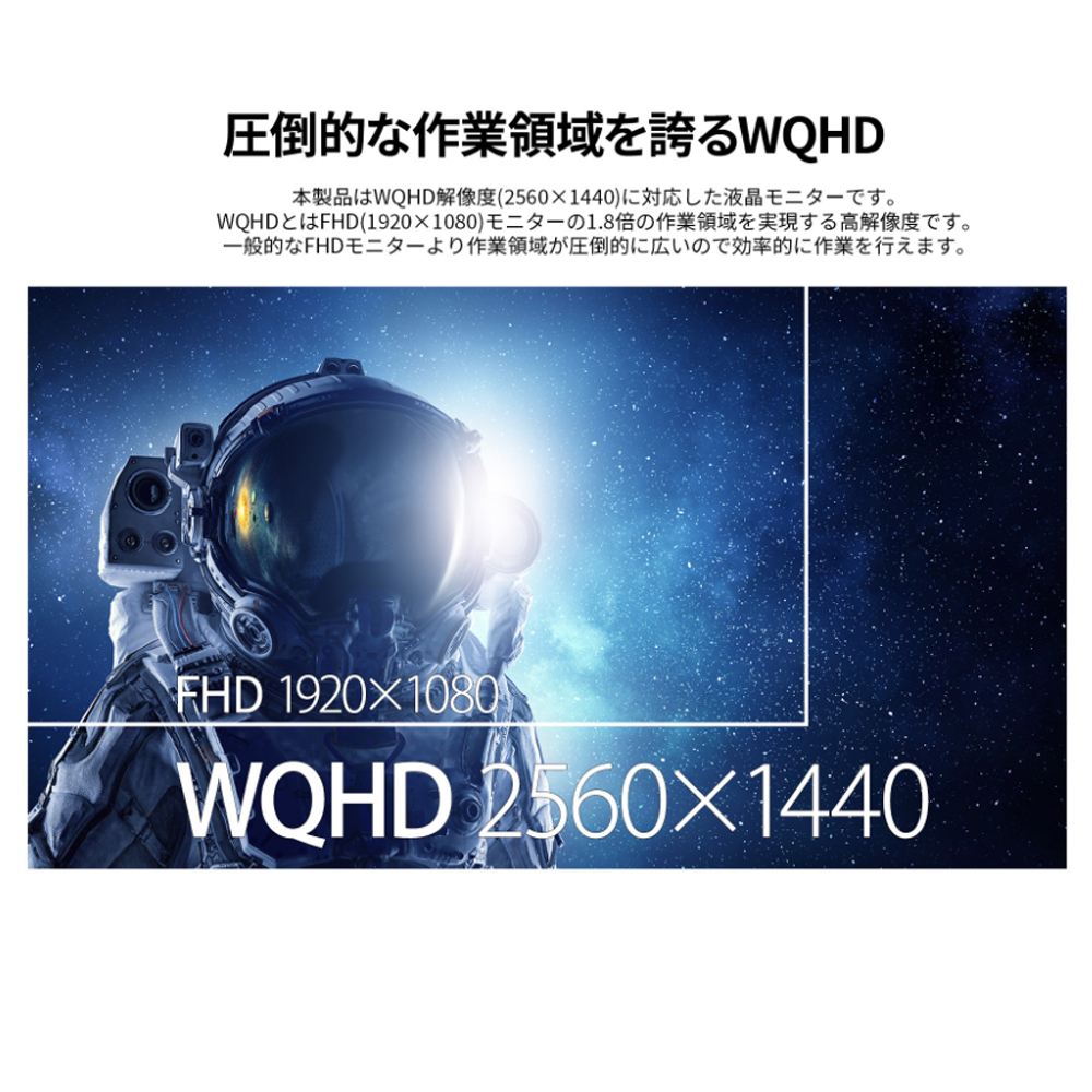 本製品は、27インチのIPSパネルを搭載し、WQHD(2560x1440)解像度に対応した液晶モニターです。フルHD(1920x1080)より+78%も高精細でデスクワーク使用時には画面を広く、また写真や動画視聴の際はさらに美しく表示します。