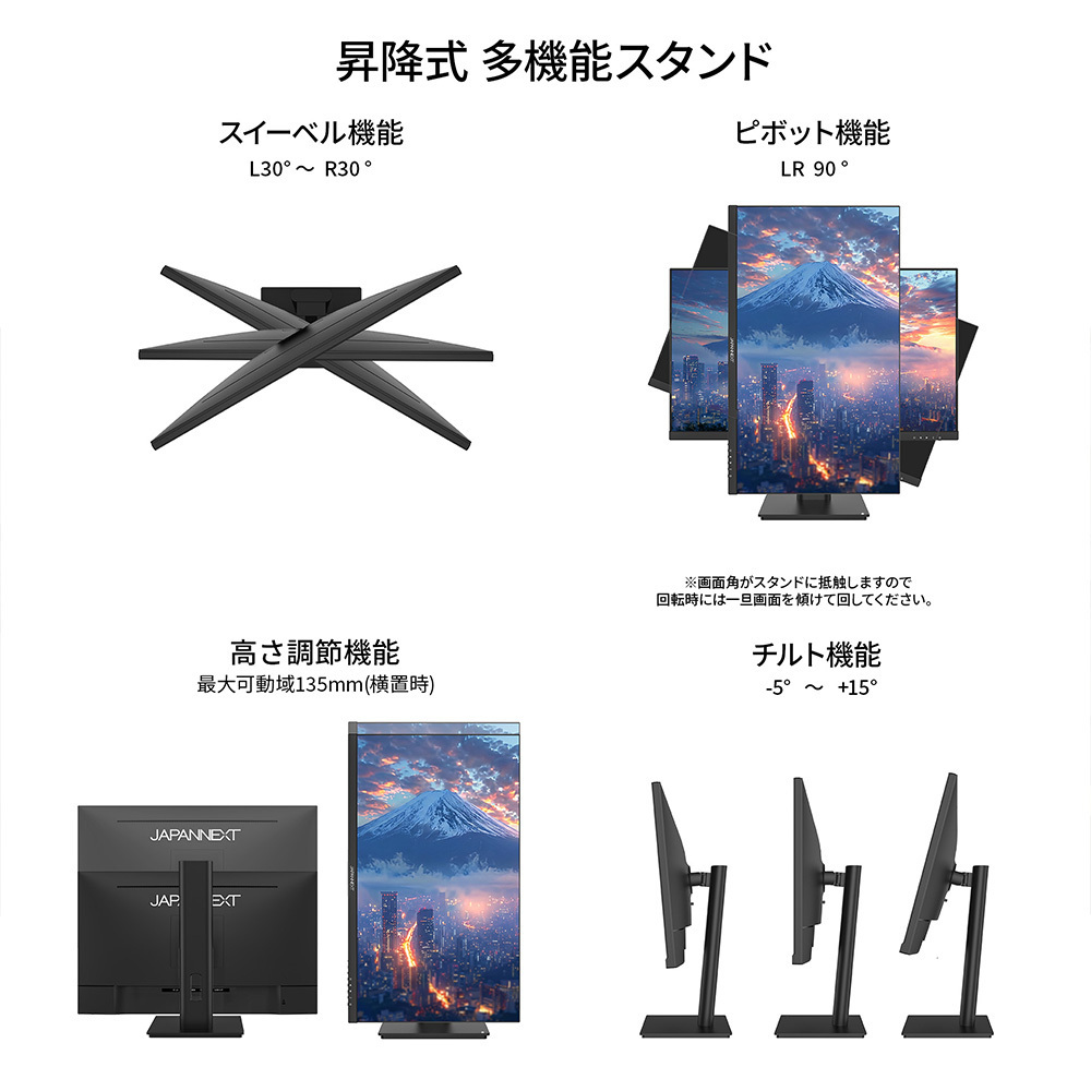 高さ調整が可能な昇降式多機能スタンドを搭載、最大135mmの範囲(横置時)で最適な高さに画面を調整可能です。また、縦画面として使用出来るピボット(回転)機能にも対応します。スイーベル(首振り)機能は、左右各30°の範囲で動かせます。