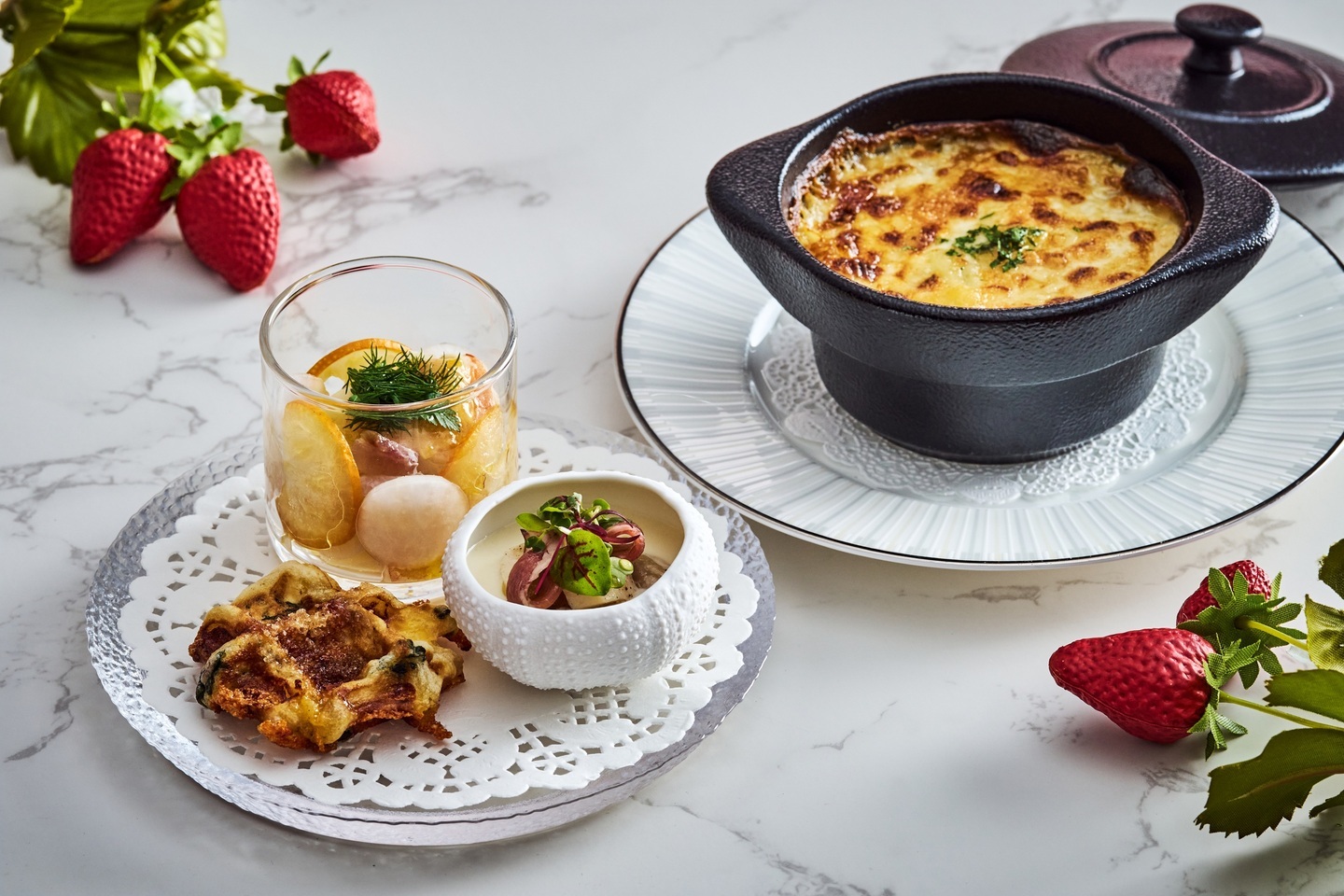 国産牛ビール煮込みのグラタンや、季節野菜にベーコンとチーズを合わせたワッフルなど、まだ冬の名残が感じられる時期にもぴったりの味わいです。苺スイーツの甘みを引き立てます。