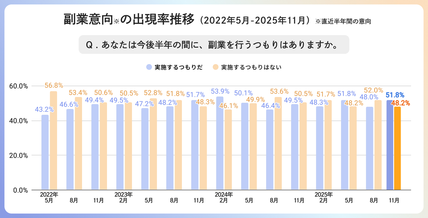 ・副業意向は51.8%と堅調。企業の容認・推奨が、副業への前向きな意欲につながる結果に