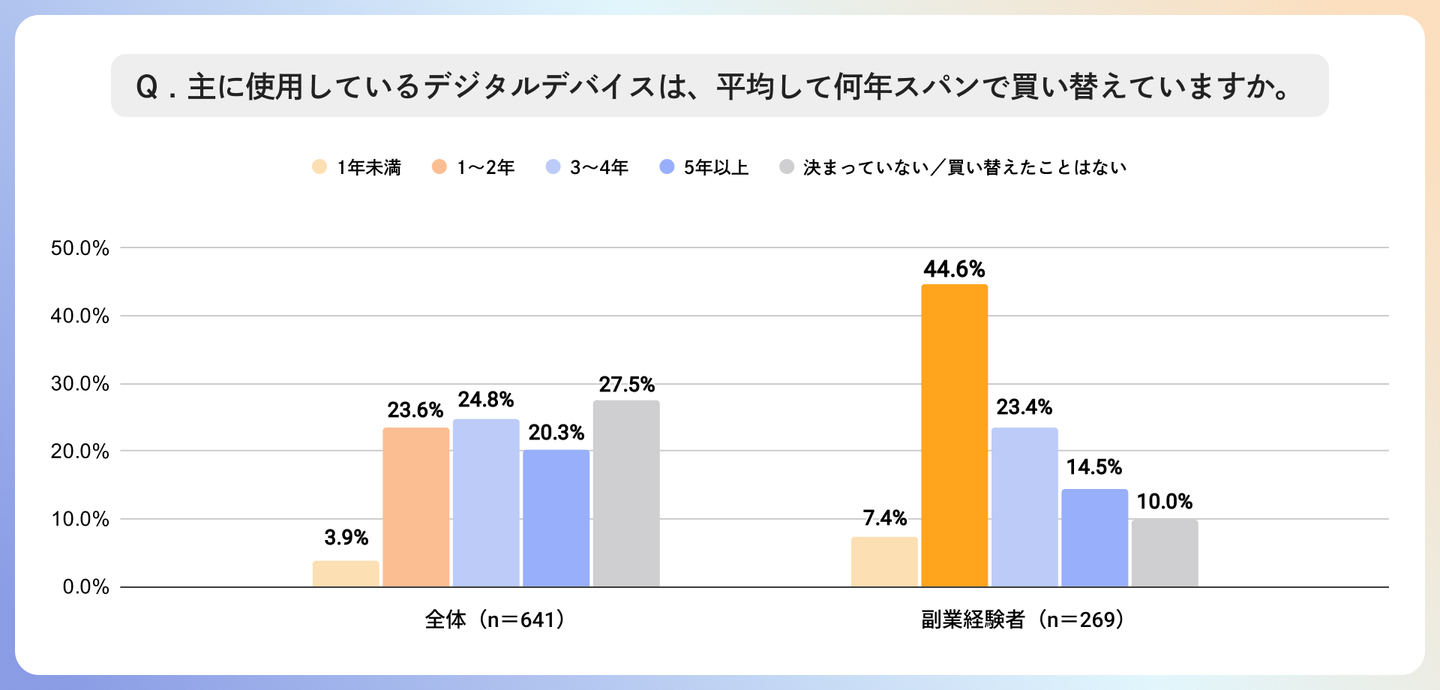 さらに、デジタルデバイスの買い替えスパンについては、全体では 「決まっていない/買い替えたことはない(27.5%)」 が最多で、次いで 「3~4年(24.8%)」、「1~2年(23.6%)」が続きましたが、副業経験者を見ると、「1~2年(44.6%)」での買い替えが最多となり、全体よりも短いサイクルで積極的にデジタル環境をアップデートしていることが明らかになりました。