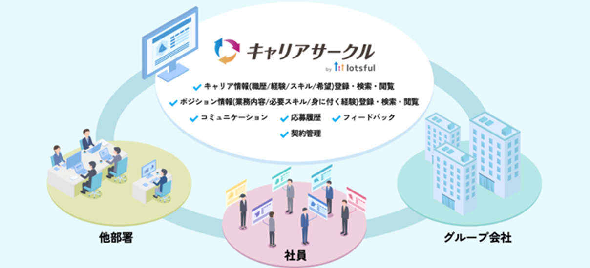「キャリアサークル」は、『lotsful』が提供する企業人事担当者向けのキャリア支援プラットフォームです。パーソルグループで独自開発した社内向けシステムをベースに、社内・グループ内の異動や副業に特化した機能を提供し、公募型異動や企業内副業の求人情報や選考状況の一括管理、応募、体験の可視化をシームレスに実現します。3万件の副業マッチング実績をもつ専門コンサルタントが制度設計や風土醸成、社内求人の要件定義やコンテンツの企画に伴走支援します。