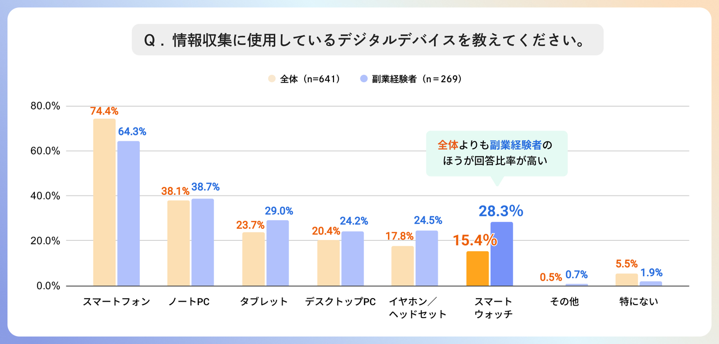 情報収集に使用しているデジタルデバイスについて尋ねたところ、最も使用するデバイスは 「スマートフォン(74.4%)」、使用するデバイスの台数は 「1台(51.3%)」 が最多でした。副業経験者では全体と比べて「スマートウォッチ(28.3%)」の使用者が多く、デバイス台数も「2台(36.7%)」の回答が全体より2.7ポイント多い結果となっており、ウェアラブル端末を含む、複数のデバイスの活用が進んでいる様子もうかがえます。