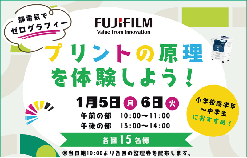 富士フイルムの体験型施設 Green Park FLOOP(フループ) で、1月5日(月)・6日(火)、冬休み限定イベントを開催。コピー機やプリンターで使われている「ゼログラフィー(静電気を使った印刷技術)」の仕組みを、見て・触れて・体験しながら学べます。冬休みの自由研究や、ものづくり・科学に興味のあるお子さまにぴったりの体験イベントです。