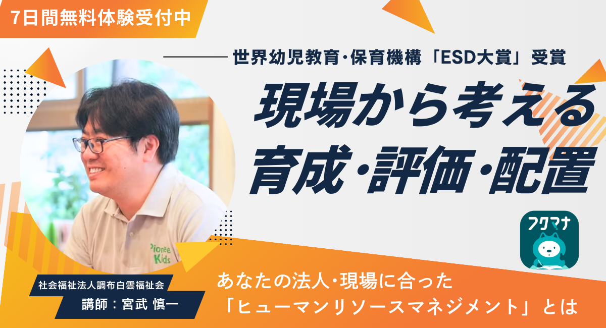 「福祉の根を伸ばしインクルーシブ社会を目指す」合同会社フクノネ(所在地:東京都三鷹市、代表:和久津 亮)は、保育・介護・障がい福祉等の福祉経営・内部管理知識をオンラインで学ぶ「フクマナ」にてゲスト講師を招いた特別講義を開講しました。第二回となる今回は、世界幼児教育・保育機構「ESD大賞」を受賞された「パイオニアキッズ」を運営する社会福祉法人調布白雲福祉会理事長、宮武慎一氏が登壇します。