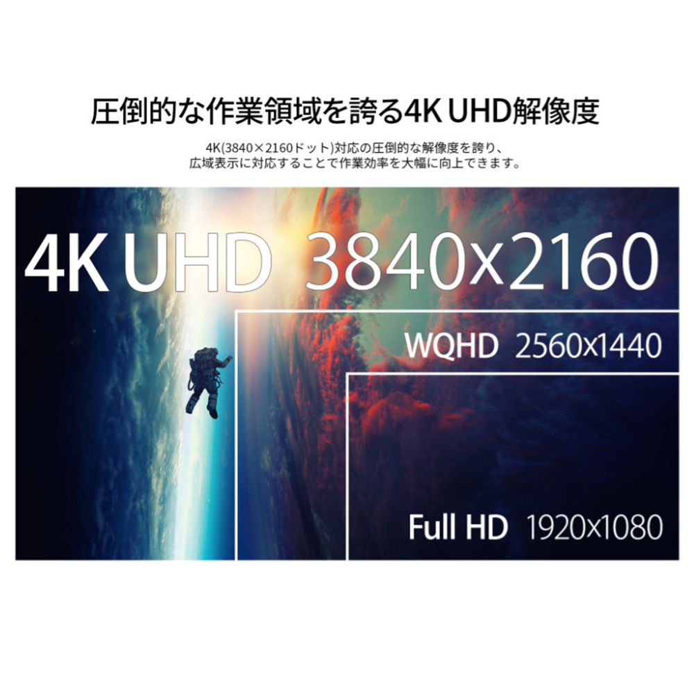 4K(3840x2160)解像度に対応。フルHD(1920x1080)解像度の4倍の高解像度は複数のウィンドウの同時表示を可能にし、圧倒的な高生産性を実現します。