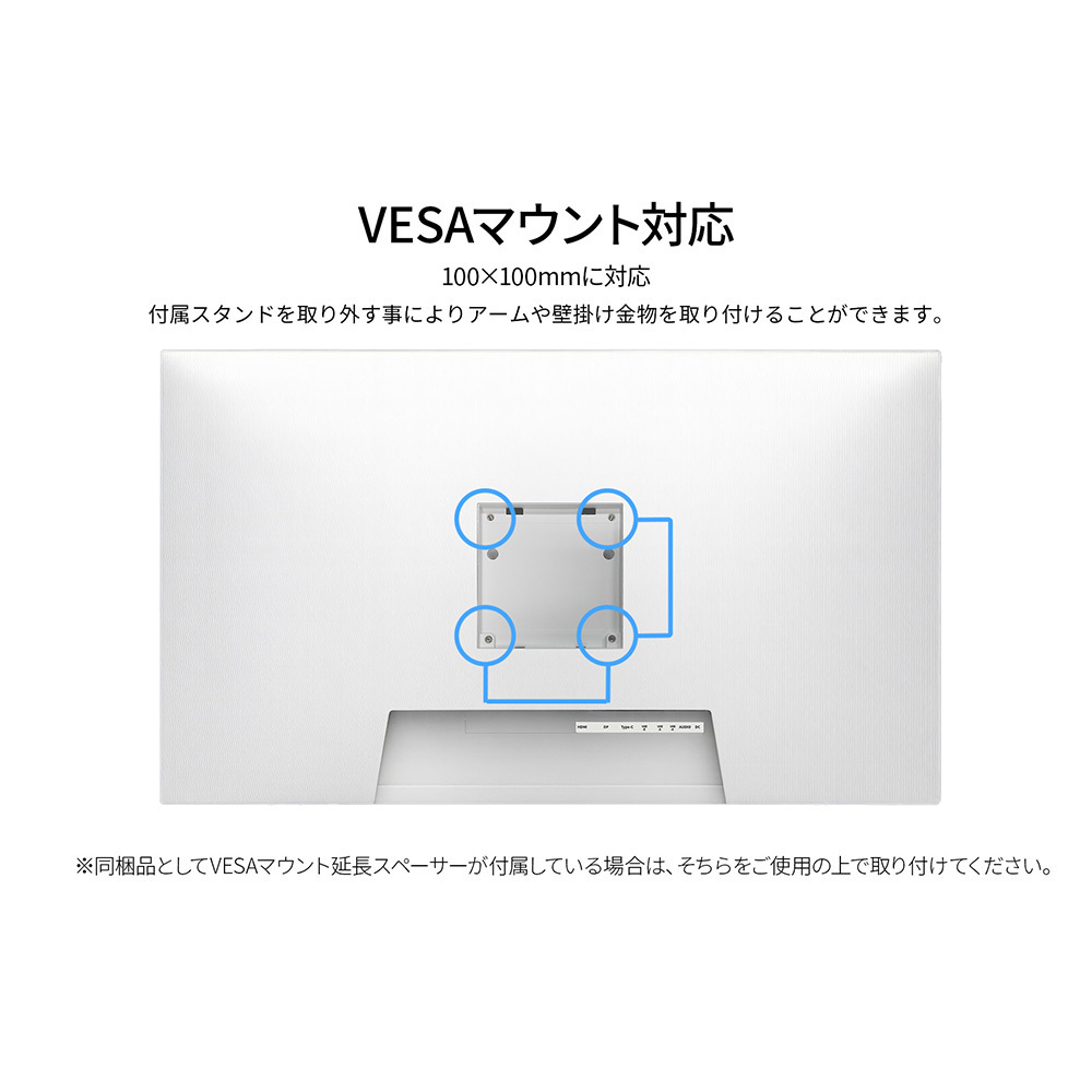 100x100mmのVESAマウントに対応しますので、別売りのモニターアームなどに使用が可能です。2Wx2のスピーカーを搭載しております。