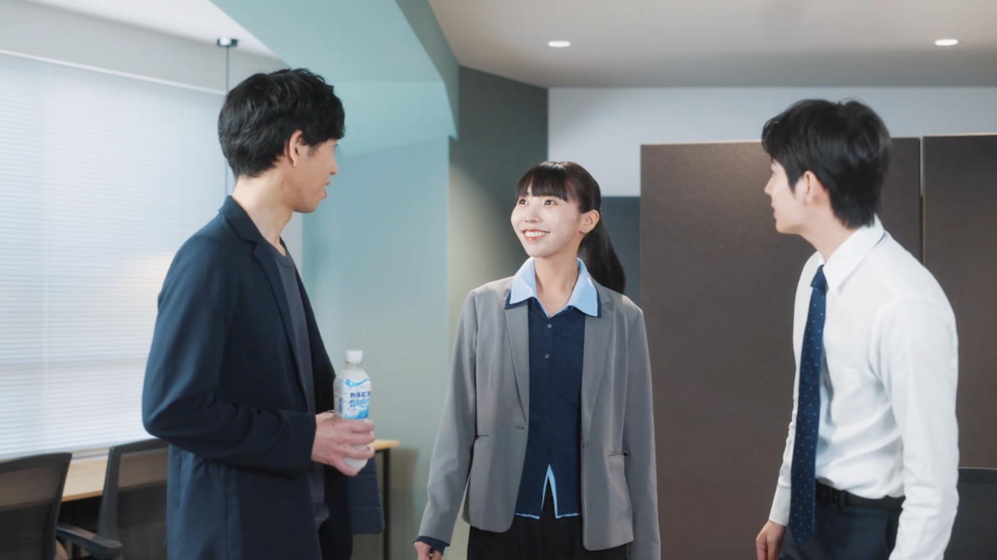 「働く人のミカタ自販機」の紹介動画では、新入社員を見かけた先輩社員が「新入社員の鈴木君だっけ? もしよかったらキーワード教えてよ」と声を掛けます。すると新入社員が「ありがとうございます! テニスです」と答えると、先輩社員は「え、僕も学生時代テニス部でさ」と応じ、話すきっかけが生まれます。