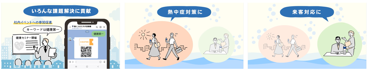 「働く人のミカタ自販機」は、LINEを通じて社員へ飲料を手軽に配布できる法人向けサービスです。利用者が新入社員や異動者などの対象者から聞いたキーワードを導入企業専用LINEへ入力すると QRコード (クーポン)が発行され、自販機のキャッシュレス決済端末にかざすと飲料を無料(飲料代金は導入企業負担)で受け取ることができます。社員がそれぞれのキーワードを交換する仕組みを通じて社員同士の会話のきっかけを創出し、企業内のコミュニケーション促進を図ります。