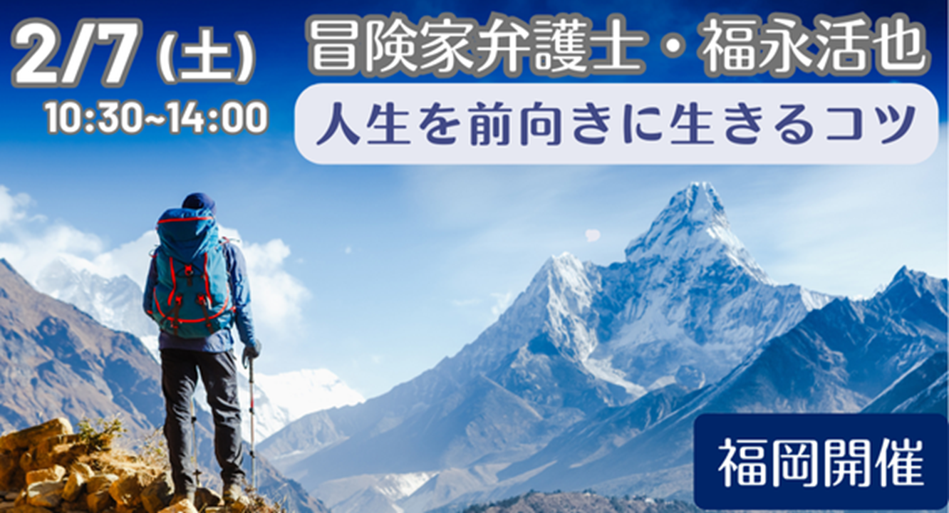 金融商品取引サービスを提供する岡安商事株式会社(本社:大阪市中央区、代表取締役社長:杉本良隆)は2026年2月7日(土)、福岡市博多区・キャナルシティ博多にて、特別セミナー『人生を前向きに生きるコツ 冒険家弁護士福永活也×カギ足職人コラボセミナー』を開催します。