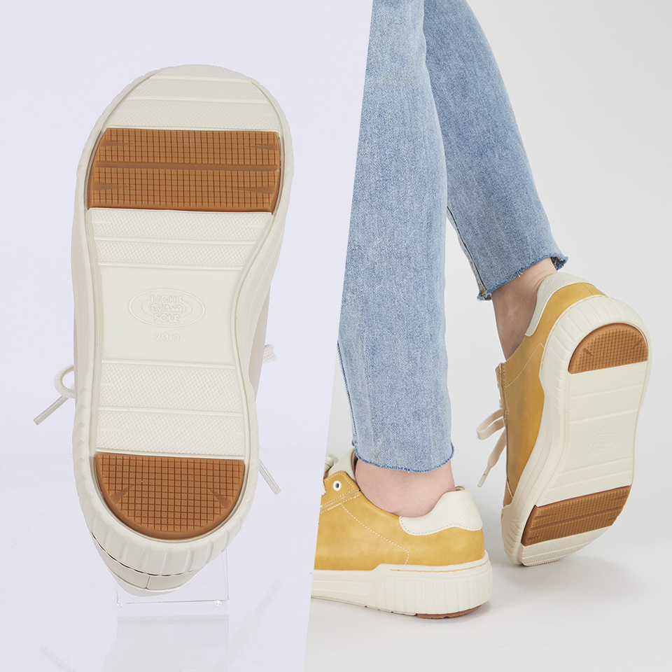象徴的なコロンとしたソールには、EVA素材にラバーを独自配合した高耐久ソール「ライトエバーソール®」を採用。軽量性と耐久性を高いレベルで両立し、日常の歩行から長時間の外出まで、安定感のある履き心地で足元をしっかりとサポートする。さらに接地面には滑り止めゴム素材をプラスし、グリップ力を高めることで雨上がりの路面でも安心して歩ける設計とした。こうした耐久設計は数値でも裏付けられており、摩耗試験ではEVA部分で基準値の1.6倍、ラバー部分では3倍以上の耐摩耗性能を記録。毎日履くことを想定した一足として、長く安心して使える耐久性を備えている。