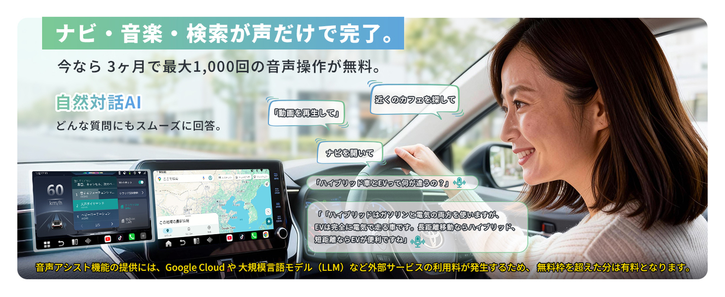 音声操作だけで、ナビ設定、音楽再生、通話、分割画面切替まで対応します。