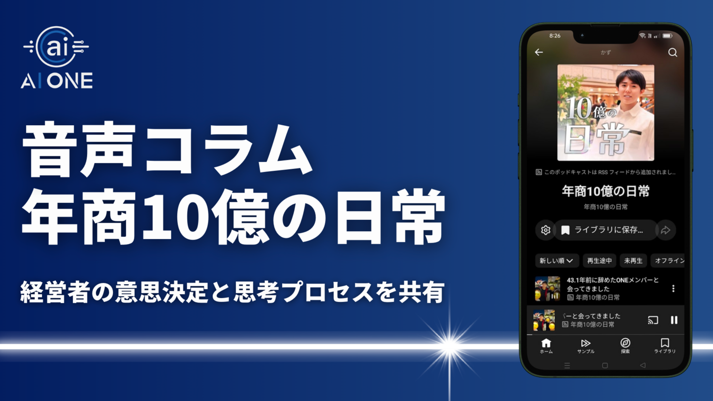 「AI時代の最前線で、あなたの可能性を解き放つ」を理念に掲げ、AIスクール「AI ONE」を運営する株式会社AI ONE(所在地:神奈川県横浜市、代表取締役:森谷和正)は、森谷和正による音声コラム「年商10億の日常」の配信を、2025年12月5日より開始いたしました。本企画は、年商10億円規模の事業を運営する経営者が、日々の仕事や生活の中で行っている意思決定や、その背景にある思考の軸を音声で共有する取り組みです。YouTubeのポッドキャスト形式で配信されており、AI ONEの生徒およびコミュニティ向けに、追加費用を伴わず提供されています。