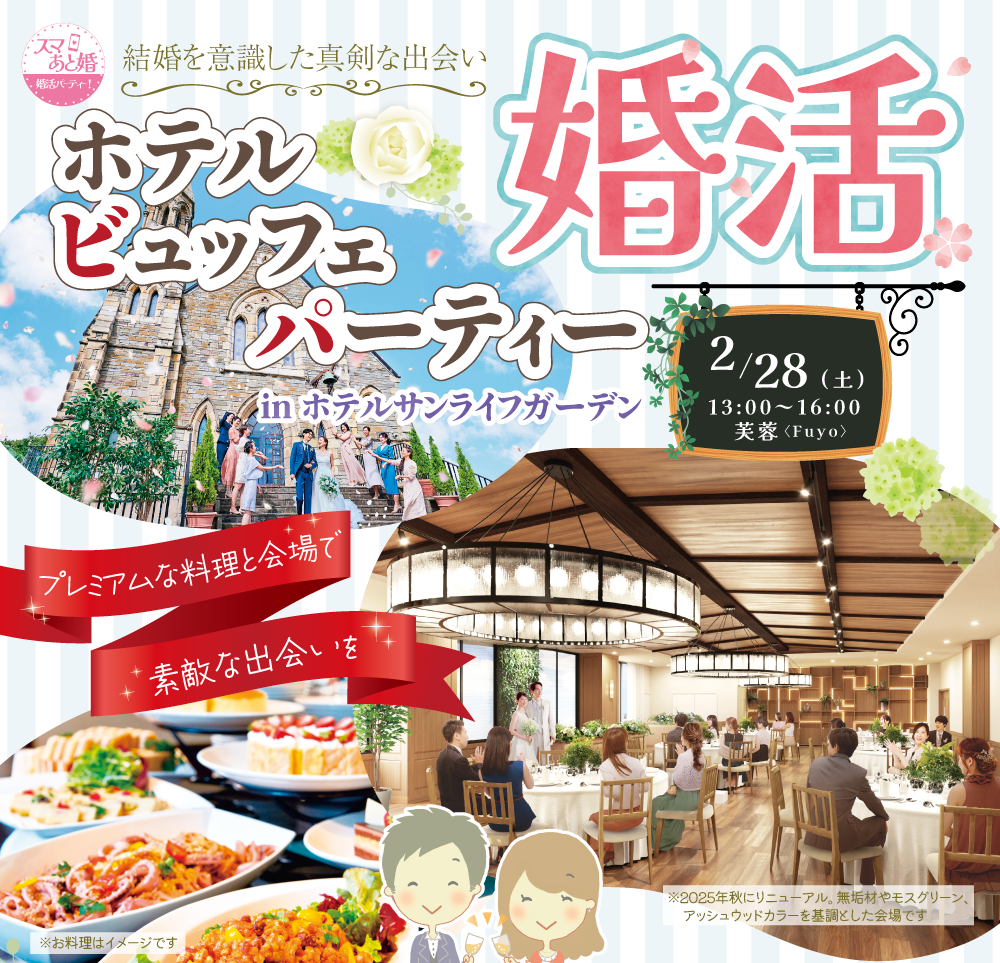 スマートフォンを活用した婚活イベントを企画・運営する「スマあと婚」(運営:有限会社ビットシステム/所在地:神奈川県平塚市)は、2026年2月28日(土)、平塚市の結婚式場「ホテルサンライフガーデン」にて、ホテルビュッフェ付き婚活パーティーを開催いたします。本イベントは、結婚を真剣に考える25歳〜45歳の男女を対象とした婚活パーティーです。格式あるホテル会場で、上質な料理を楽しみながら、落ち着いた雰囲気の中で自然な交流ができる点が特徴です。