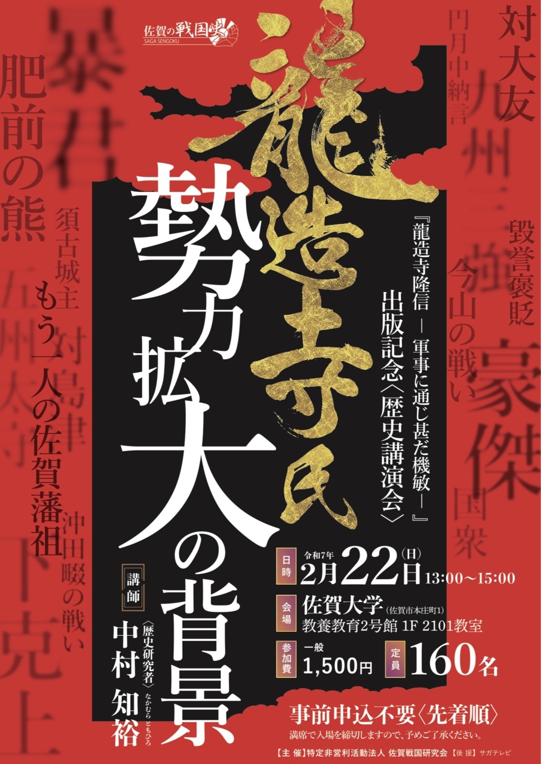 <最新研究により変化した、龍造寺隆信の人物像>★『龍造寺隆信 -軍事に通じ甚だ機敏 -』出版記念講演会「龍造寺氏勢力拡大の背景」■講師:中村知裕(歴史研究者)■日時:2026年2/22(日)13:00~15:00 ■会場:佐賀大学 教養教育2号館 1F 2101教室 ■後援:サガテレビ ■参加費:1500円 ★定員160名程)http://sagasengoku.seesaa.net/article/519019806.html