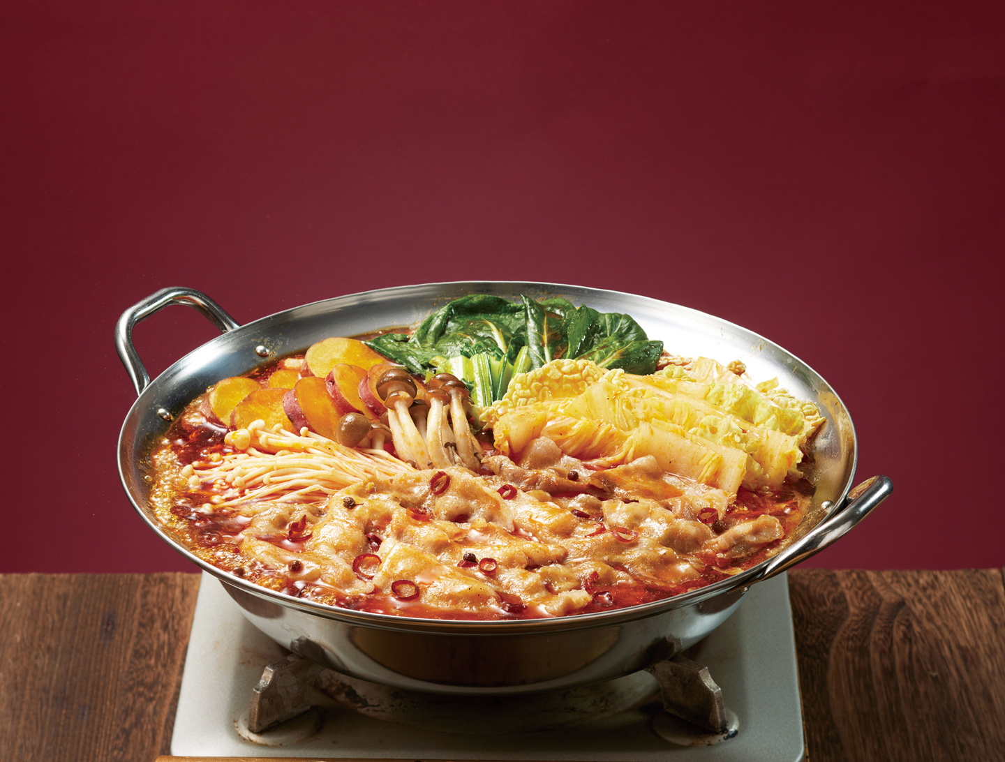 畳の小上がりにこたつ席を設けた体験型エリアで、自分好みの鍋づくりを楽しめます。