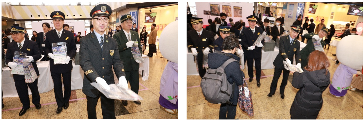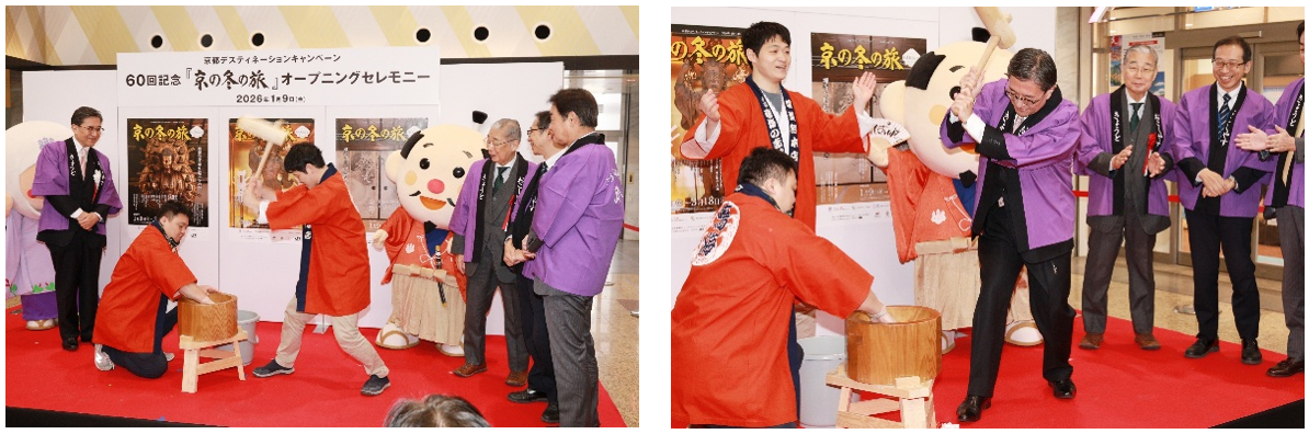 また、「京の冬の旅」の開始に伴い、1月9日にオープニングイベントを実施。京都市長をはじめとする主催者やキャンペーンを支える鉄道関係者が参加しました。イベントでは、私鉄とJRの6駅長によるオープニング宣言をはじめ、餅つきと紅白餅の振る舞いや京都駅社員による演奏が行われるなど、60回目の「京の冬の旅」の開催を盛大に祝いました。