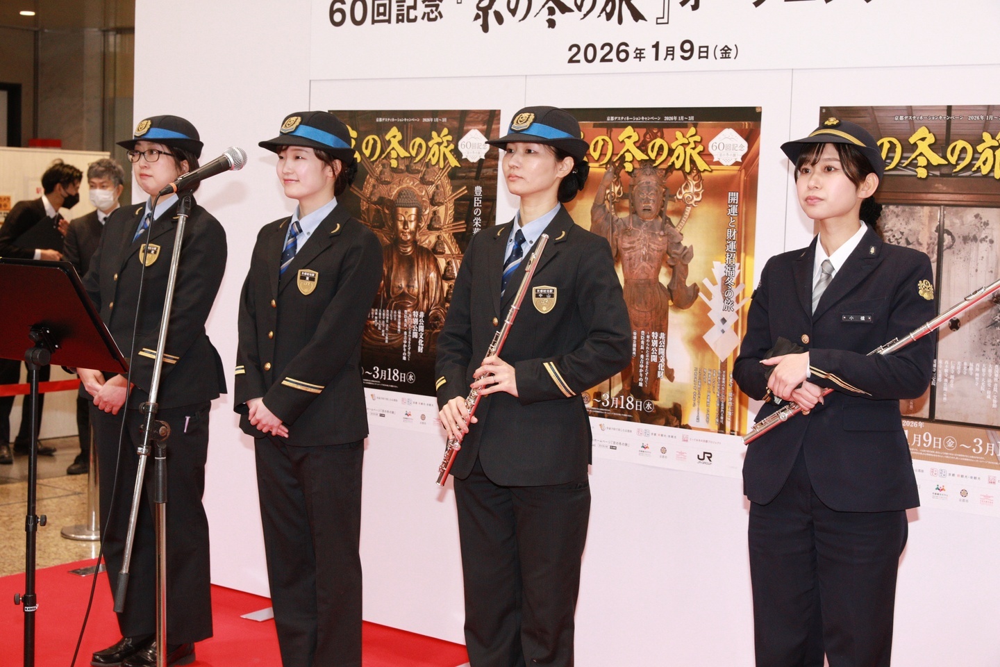 60回目となる「京の冬の旅」キャンペーンを記念し、1月9日に京都駅でオープニングセレモニーを実施しました。京都市長はじめ地元関係者や鉄道関係者が参加し、セレモニーは盛大に執り行われました。主催者や来賓の挨拶に続き、JR西日本・JR東海・京阪・阪急・近鉄・京都市交の6駅長が登壇して、キャンペーンの開始を宣言。開催を祝う餅つきも行われ、会場に訪れた方々に紅白餅が振る舞われました。また、JR西日本・JR東海の駅員によるピアノ・フルートの生演奏がセレモニーに花を添えました。