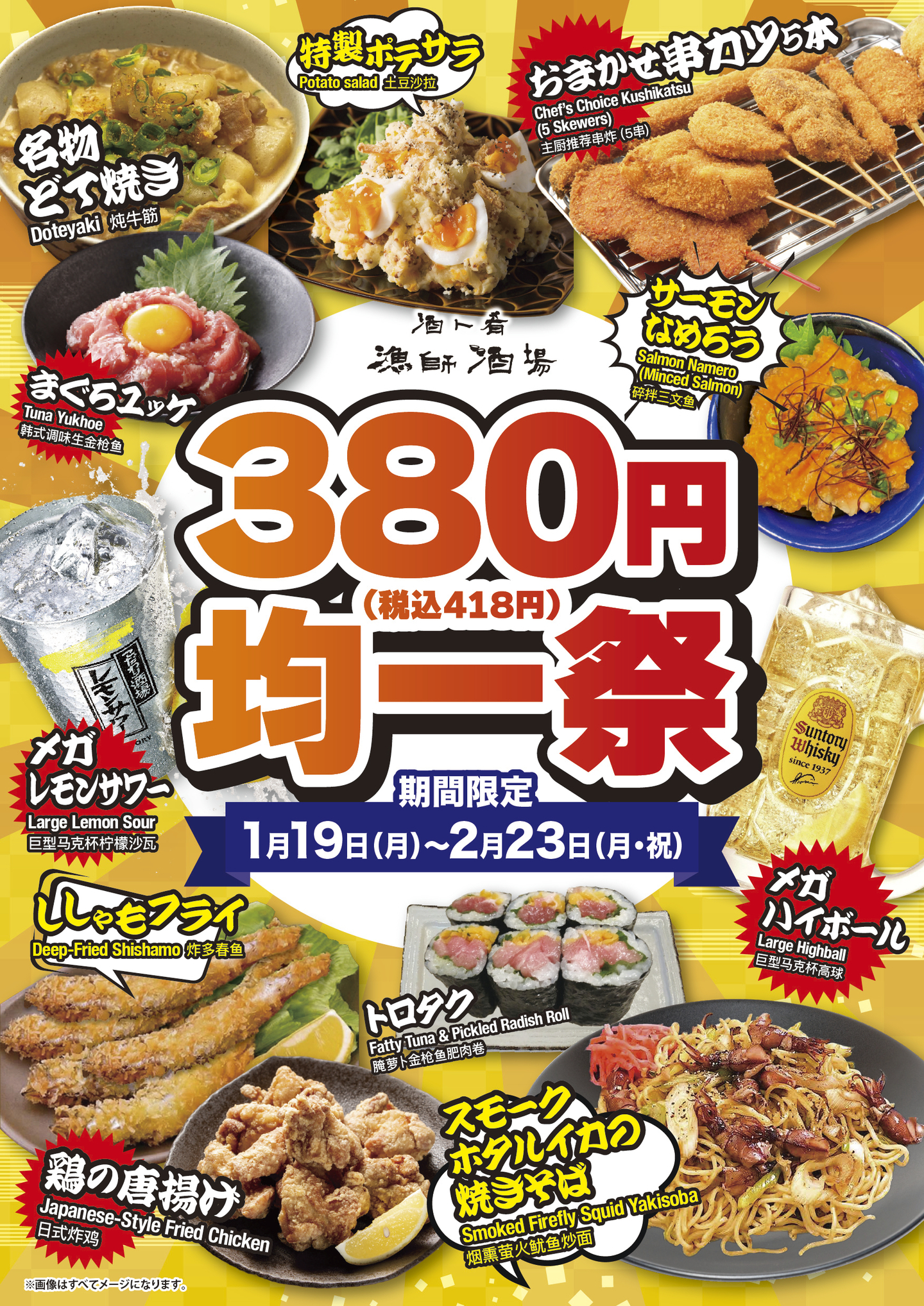 酒ト肴 漁師酒場では、2026年1月19日(月)から2月23日(月・祝)までの期間限定「380円均一祭」を開催いたします。