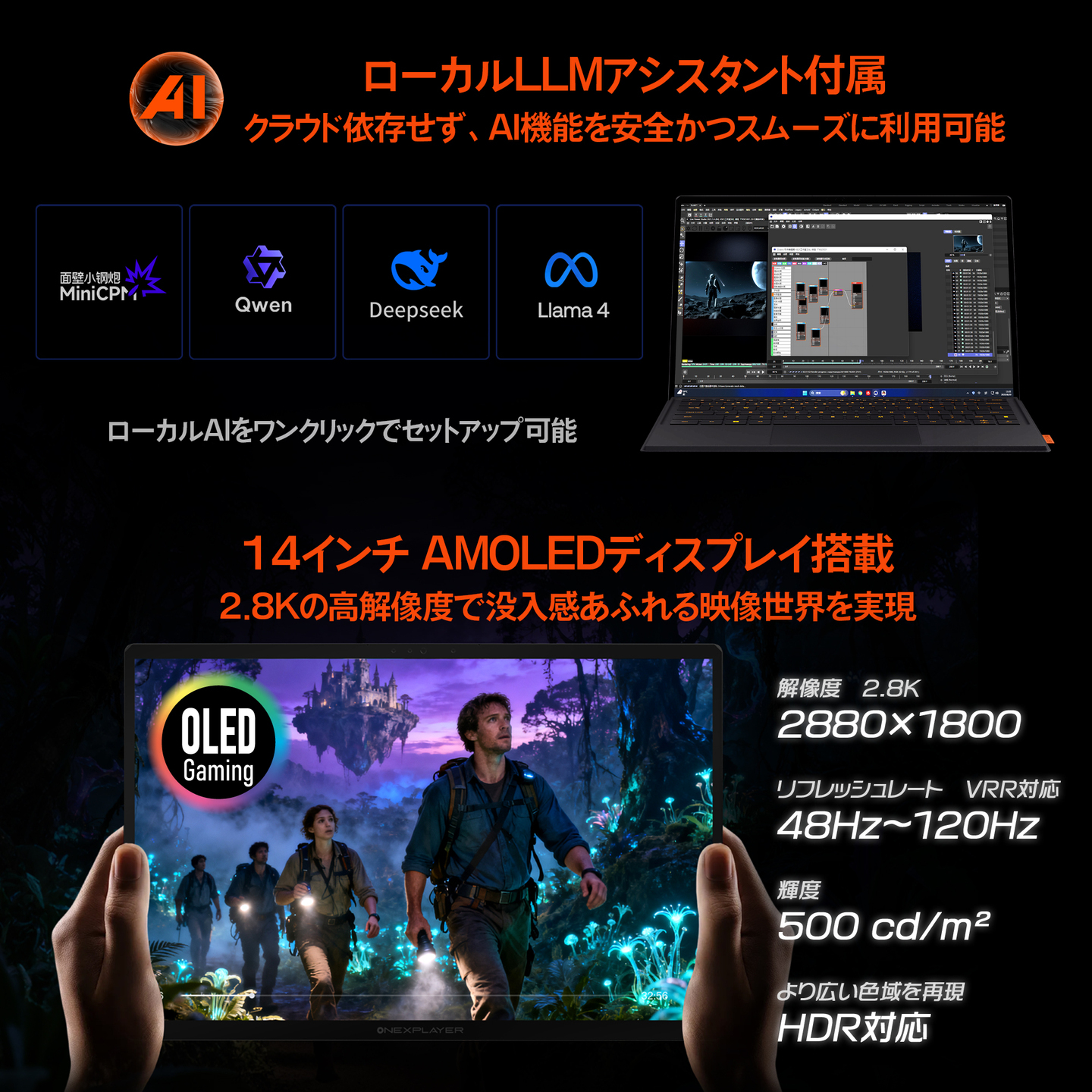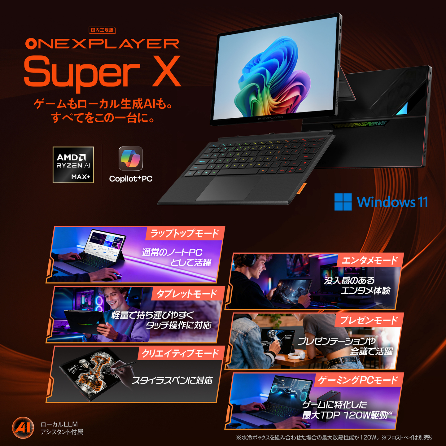 株式会社天空(東京都渋谷区、代表取締役:山田 拓郎)は、One-Netbook社が開発した、AMDの最新ハイエンドプロセッサー「AMD Ryzen™ AI Max+ 395」を搭載した14インチ着脱式2 in 1 ポータブルゲーミングPC「OneXPlayer Super X 国内正規版」を、2026年2月下旬に発売します。本機は薄型PCながら冷却性能にこだわり75W駆動(専用水冷ボックス使用時は最大125W)で、64GB以上のメモリを選ぶことでローカル生成AIにも対応します。国内正規版は、天空グループによる国内1年間の保証付き。保証期間終了後も、国内にて修理対応を行える体制を整えています