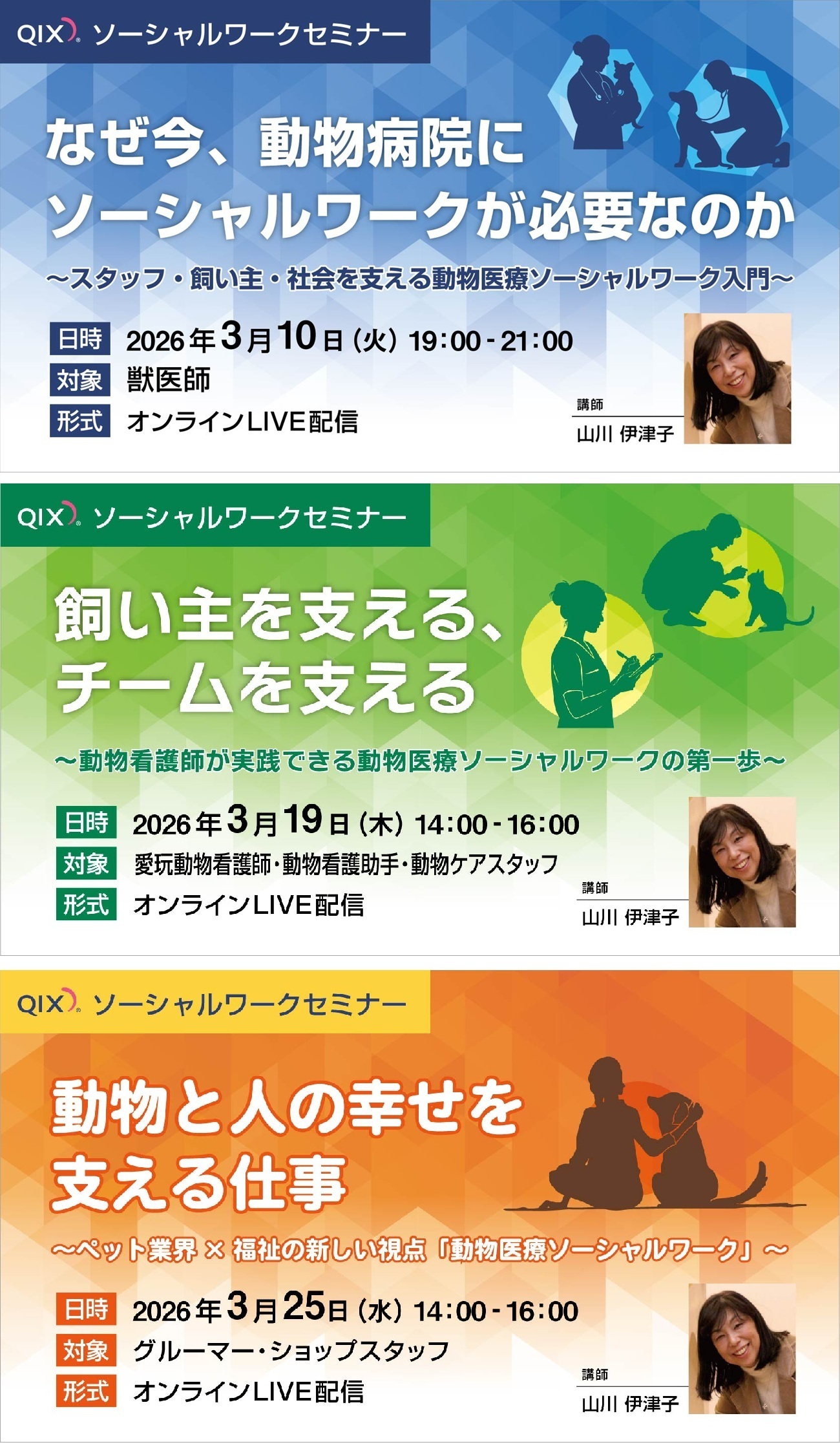株式会社QIXは、オンライン型『動物医療ソーシャルワークセミナー』3プログラムを2026年3月に開催いたします。