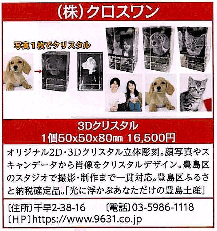 株式会社クロスワンが企画・制作する「3Dクリスタル」が、このたび豊島区観光協会認定「としま観光みやげ特集」に掲載され、「東京都豊島区 としま観光みやげ品」として正式に選定されました。