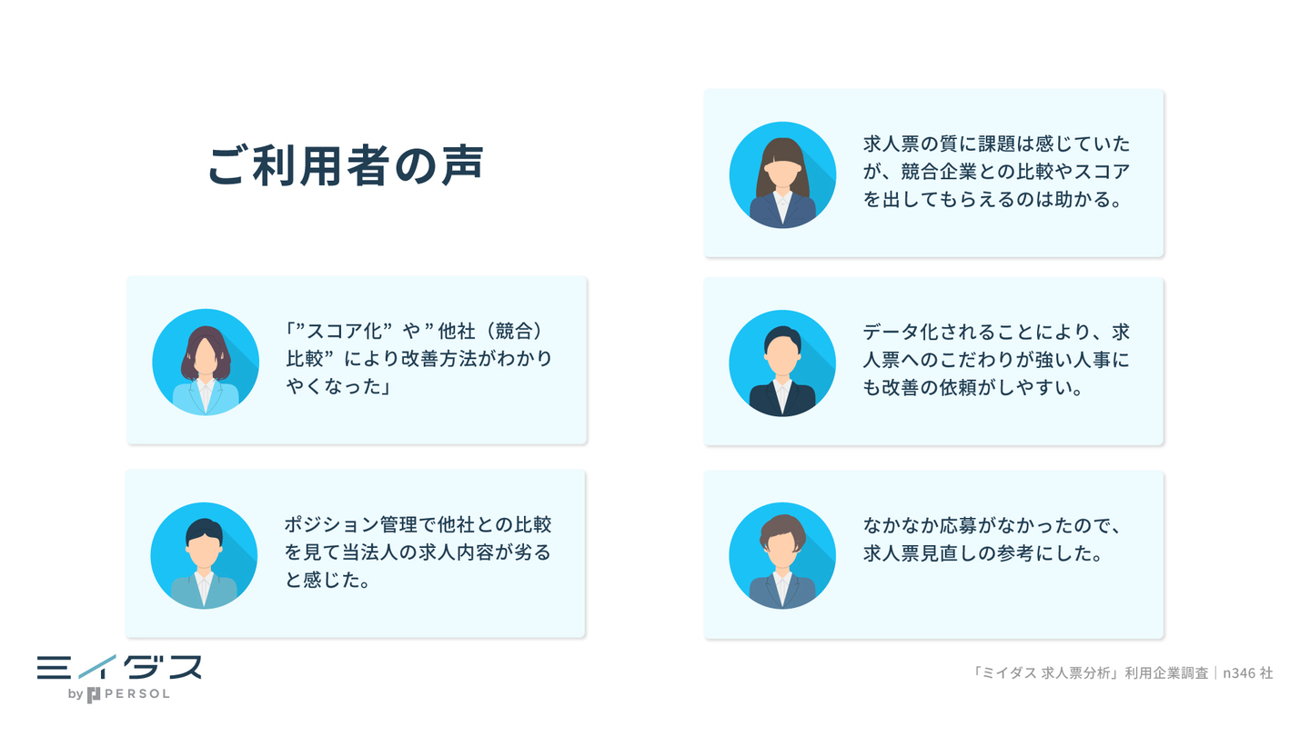 ※関連リリース:採用競争を勝ち抜くための新サービス「ミイダス 求人票分析」をリリース〜競合他社求人の比較から自社の改善ポイントを明確化~
