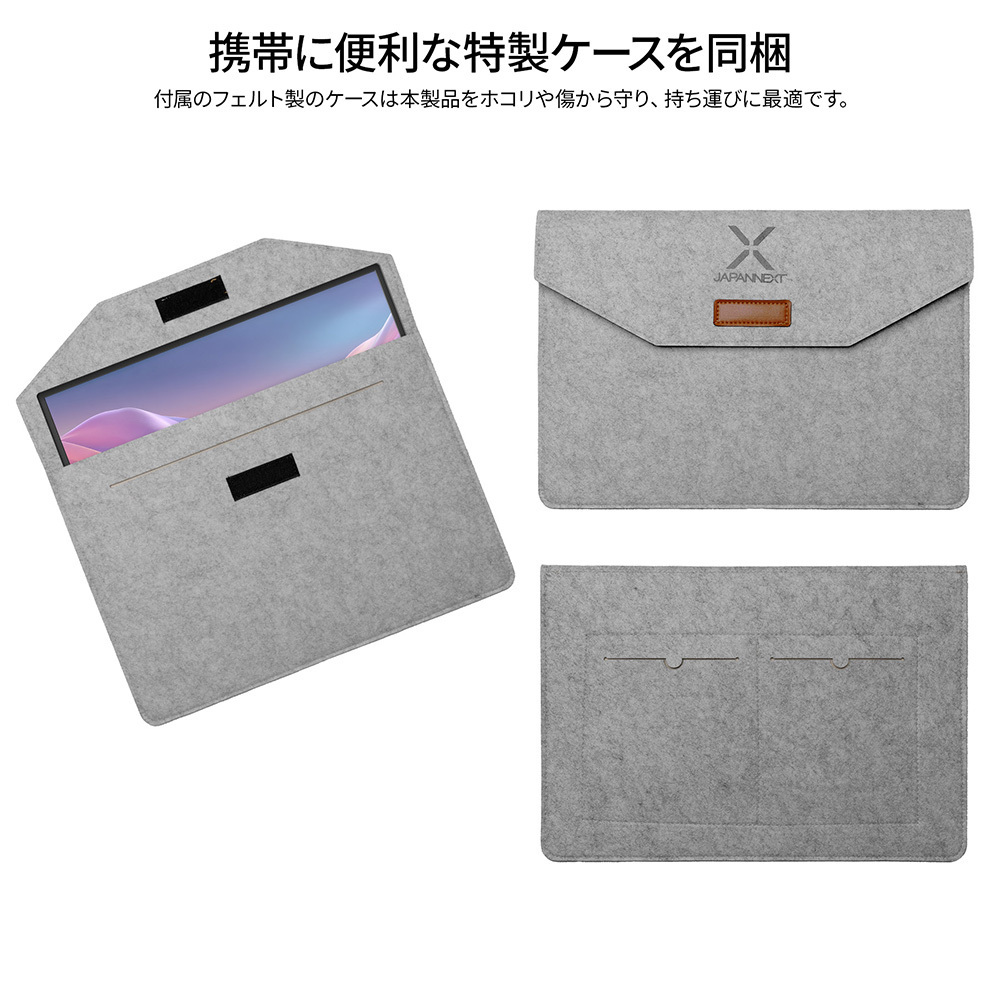モニター背面にキックスタンドを搭載しているので自立して使用することができ、どこでもデュアルディスプレイ環境の構築が可能です。また、携帯時に便利なフェルトケースを同梱。製品本体をホコリや傷から守り、持ち運びに最適です。