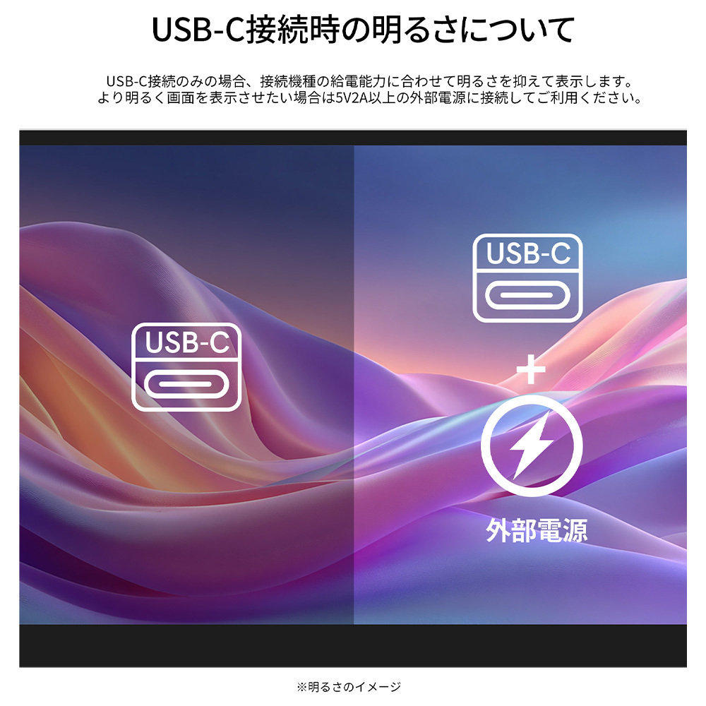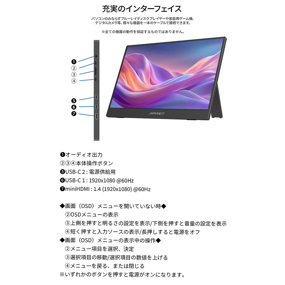 | 入出力端子 | miniHDMI 1.4 x1 (60Hz) USB-C x1 (60Hz) USB-C x1 (給電専用) オーディオ出力 x1 |