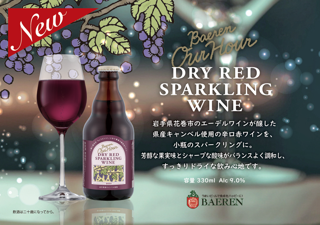 岩手県花巻市の「エーデルワイン」さまで醸造された岩手県産キャンベル使用の辛口赤ワインをベアレンがカーボネーションし、スパークリングワインに仕上げました。