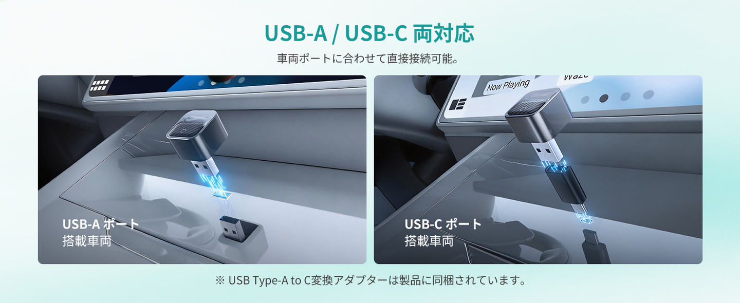 USB Type-A to C変換アダプターを同梱しているため、車両環境を選びません。