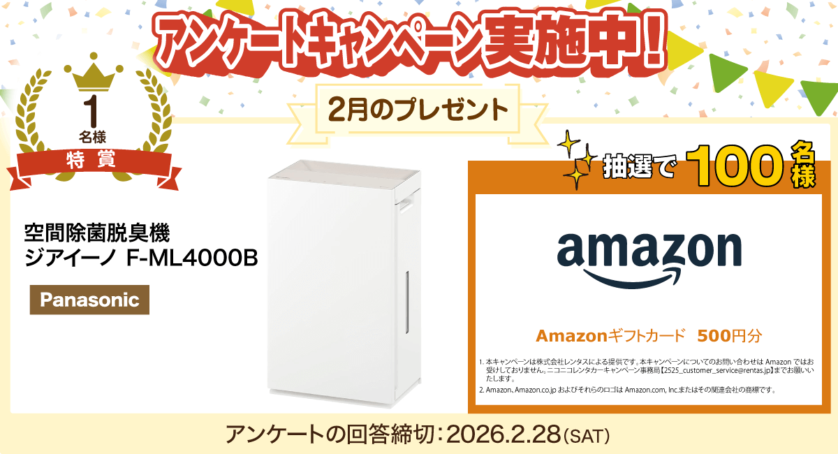 「ニコニコレンタカー」では、レンタカーご利用後に配信されるアンケートにご回答いただいた方の中から、毎月抽選で豪華景品が当たる「アンケートキャンペーン」を開催しています。2月の商品はPanasonicの「空間除菌脱臭機 ジアイーノ F-ML4000B」です。また、Amazonギフトカード500円分も抽選で100名様に当たります。ぜひこの機会に「ニコニコレンタカー」に対する率直なご意見をお聞かせください。