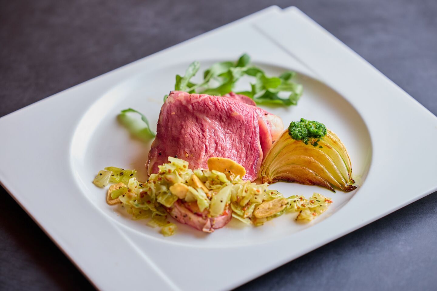 カシュカシュ伝統のローストビーフに、毎年「この季節を待っていた」と声が上がる「春のキャベツソース」が今年も登場。やわらかなローストビーフに、みずみずしいキャベツの甘みとアンチョビのコクやマスタードのアクセント、イタリア産唐辛子のほのかな刺激が重なり、ひと口ごとに春の余韻が広がります。「今しか味わえない」その特別感と、変わらぬおいしさで、口コミでも高い評判を受け続けるこの時期の定番。思わず誰かに話したくなる、そんな一皿です。