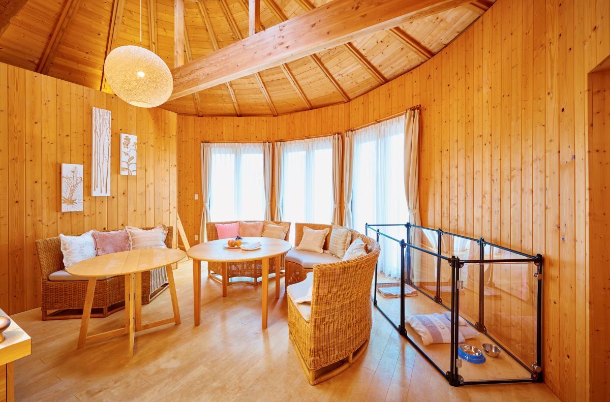 淡路島北部の静寂の中で、凛とした空気包まれる丘の上にあるラグジュアリーヴィラ「GRAND CHARIOT 北斗七星135°」では、2棟限定で愛犬と一緒にご宿泊いただけるドッグルームをご用意しております。