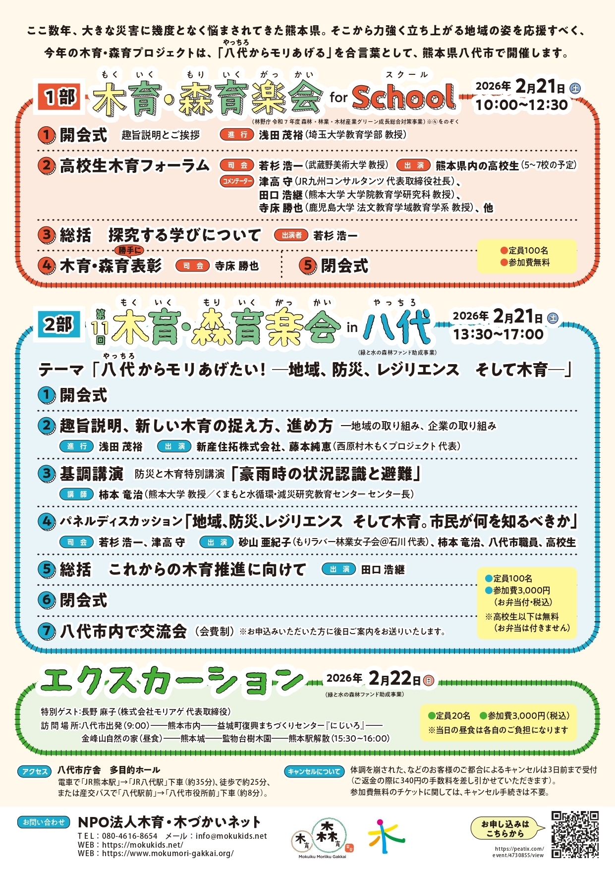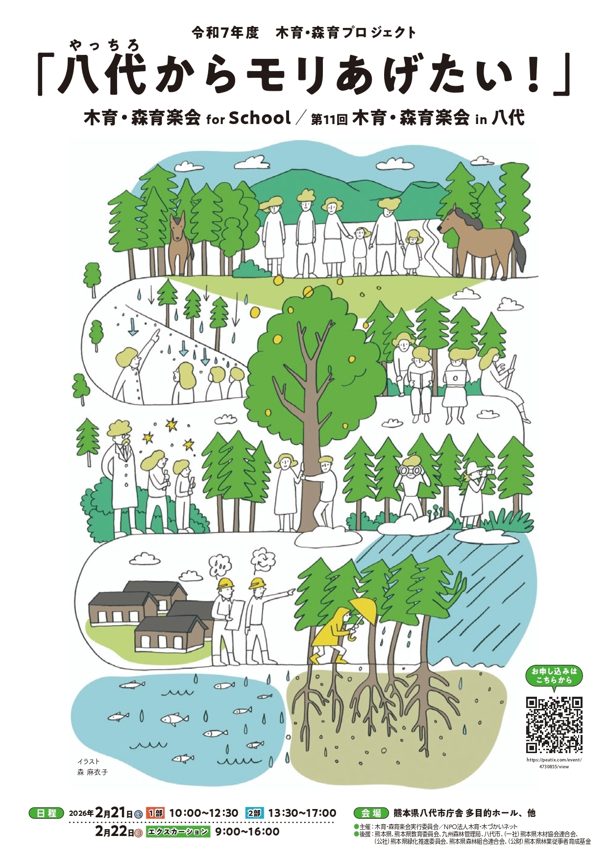 NPO法人木育・木づかいネット(理事長・埼玉大学教授:浅田茂裕/東京都中央区)では、熊本地震から10年を迎える節目に、子どもと森、そして地域をつなぐ市民向けイベント「木育・森育楽会 for School」および「第11回 木育・森育楽会 in 八代」 を、2026年2月21日(土)、熊本県八代市にて開催します。