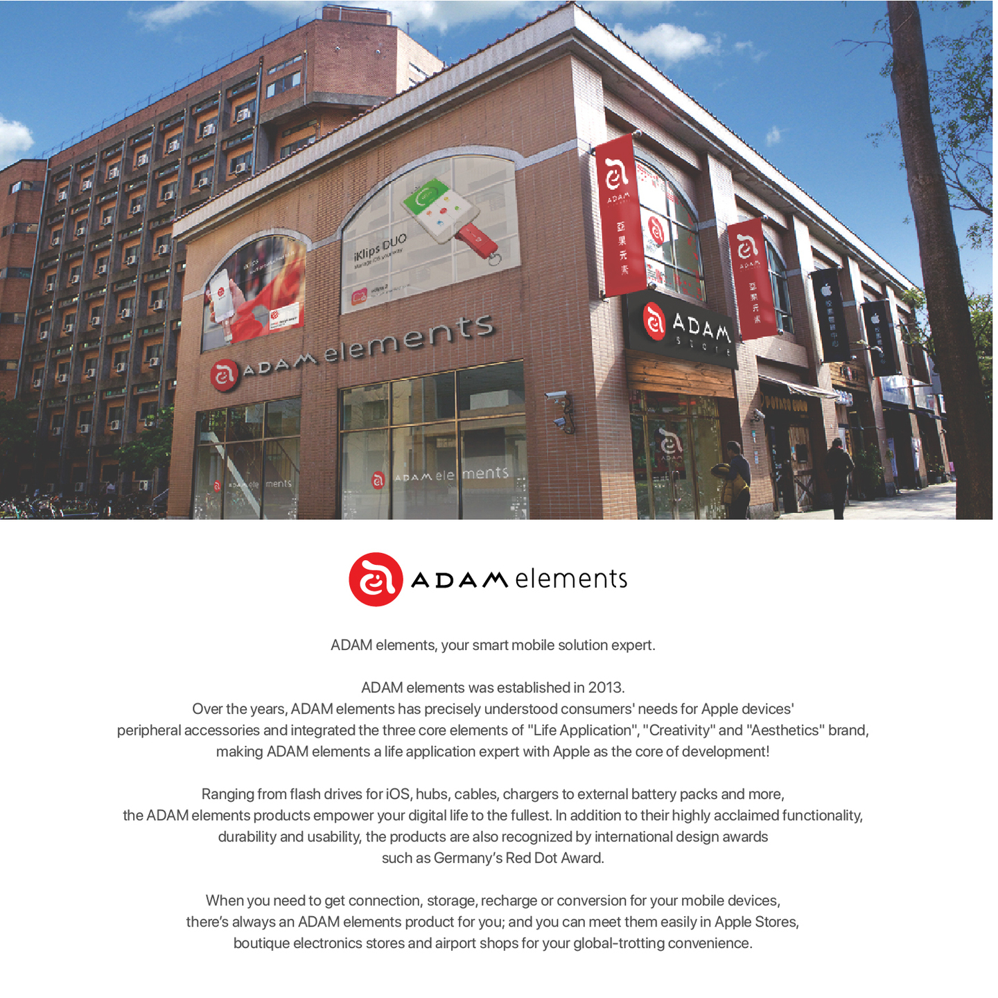 ADAM elements(アダム・エレメンツ)は、2013年に設立された台湾発のブランドで、Apple製品向けの周辺機器やモバイルアクセサリーを中心に、世界中で多数のデザイン賞を受賞。機能性・美しさ・創造性を兼ね備えたプロダクトで、デジタルライフをより便利に、安全にする製品を展開しています。