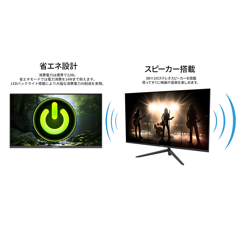 100×100mm の VESA マウントに対応しますので、別売りのモニターアームなどに使用が可能です。 3W×2のスピーカーを内蔵しています。