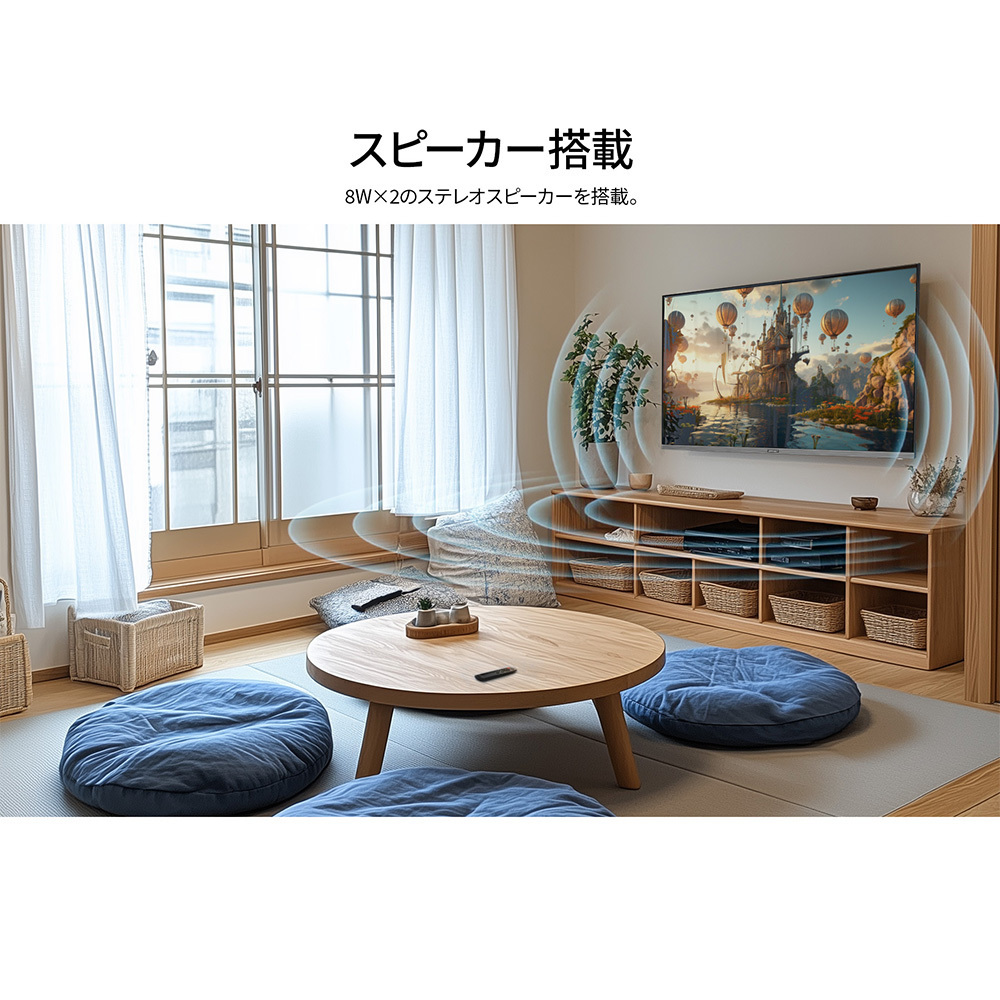 200×200mm の VESA マウントに対応しますので、対応の壁掛け金具やスタンドなどに取り付けが可能です。 8W×2のスピーカーを内蔵します。便利なリモコンを同梱。 USB メモリ再生、メニュー操作、音量調整や入力切替などの操作を行えます。本製品には、2年間のメーカー保証が付きます。