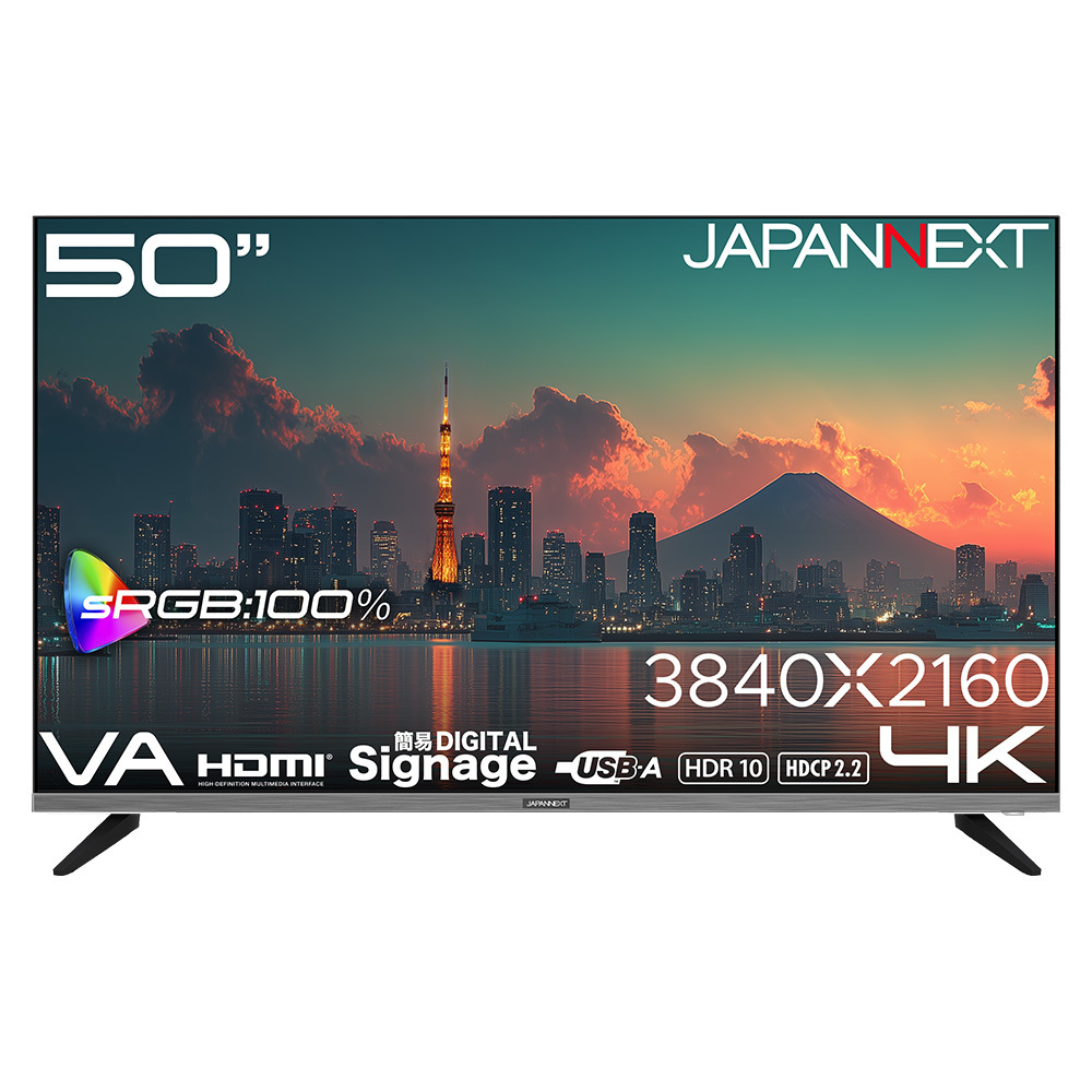 JAPANNEXT が 50 インチ VA パネル搭載 USB メモリ再生対応の大型 4K 液晶モニターをAmazon限定 49,980円で2月5日(木)に発売